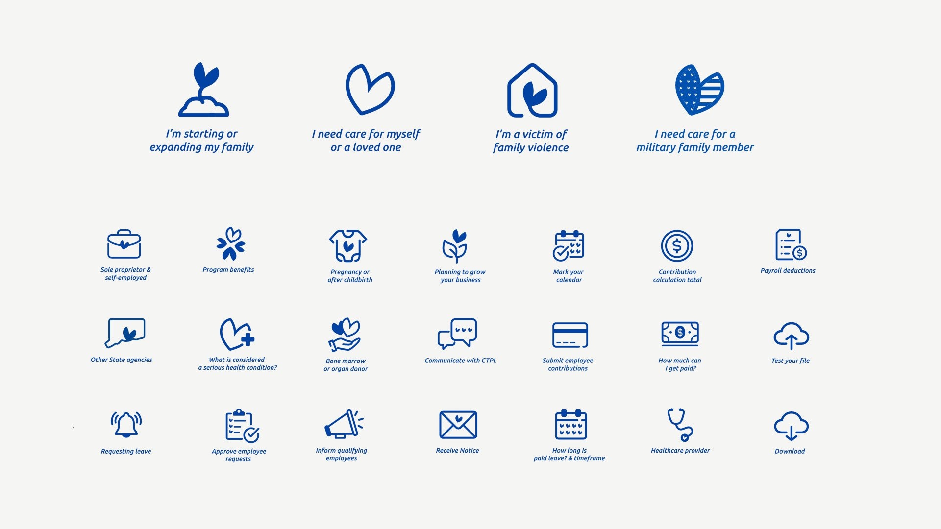 The Connecticut Paid Family and Medical Leave Insurance Authority (CT Paid Leave) was created upon the passing of Connecticut’s Paid Family and Medical Leave Act. The CT Paid Leave team chose Miranda Creative as their partner to develop a brand and brand system as well as deploy outreach campaigns to reach all businesses in Connecticut — to both introduce the law to all employers and employees, and also communicate to the state’s more than 100,000 businesses the need to properly register with CT Paid Leave.